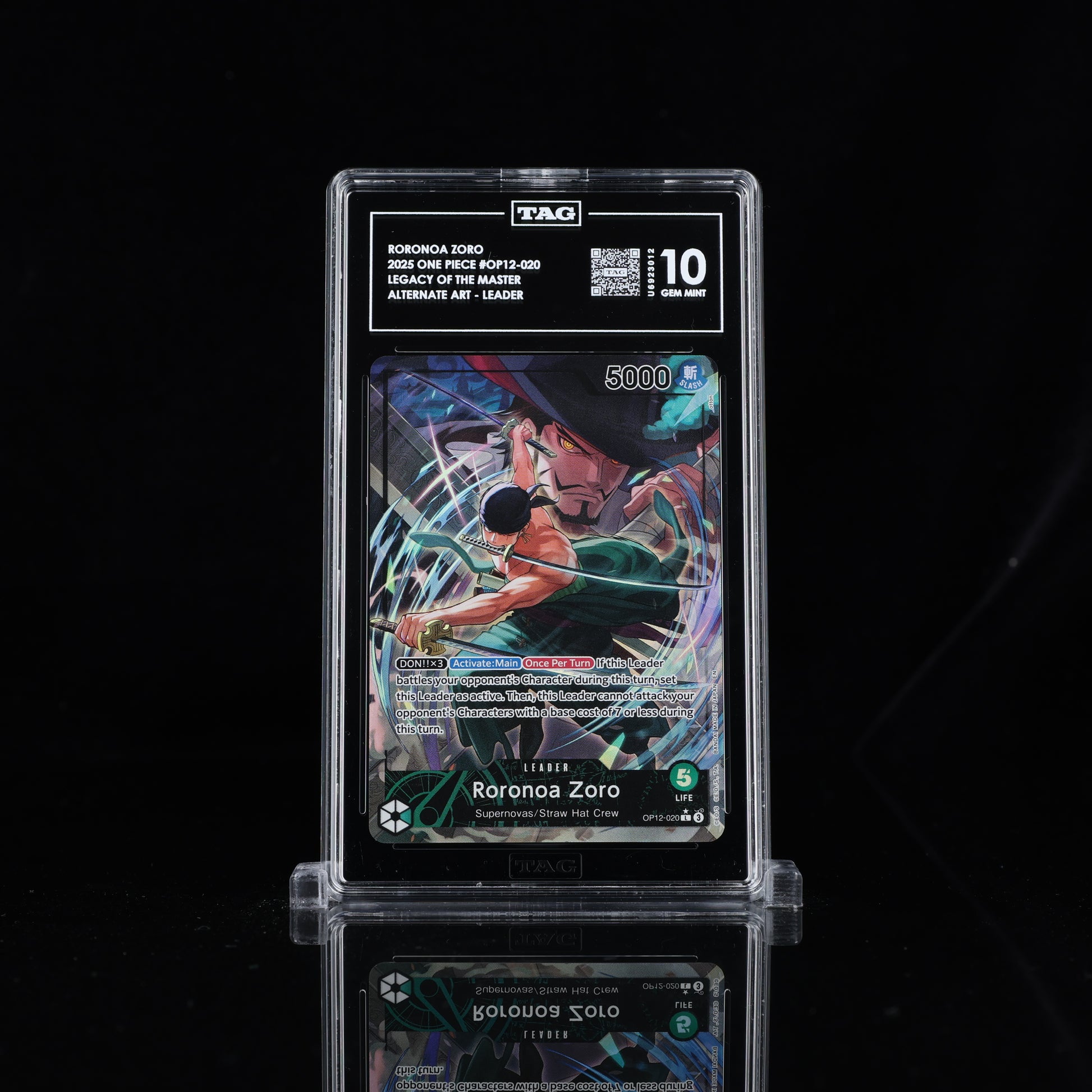 Roronoa Zoro (020) Alternate Art card from the Legacy of the Master set (OP12). This TAG 10 variant features stunning alternate artwork of the legendary swordsman. Perfect for collectors and competitive players seeking premium One Piece Trading Card Game cards. Condition and authenticity guaranteed. Add this powerful character card to your collection today.